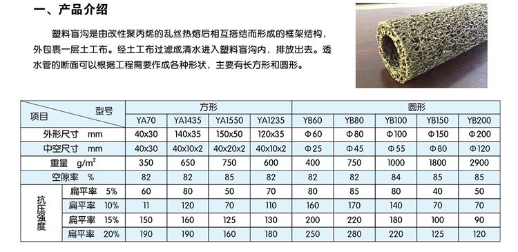 塑料盲溝是由塑料芯體外包裹濾布組式。塑料芯體是以熱可塑性合成樹脂為主要原料,經(jīng)過改性,在熱熔狀態(tài)下,通過噴咀擠壓出細(xì)的塑料絲條,再通過成型裝置將擠出的塑料絲在結(jié)點(diǎn)上熔接,形成三維立體網(wǎng)狀結(jié)構(gòu)。