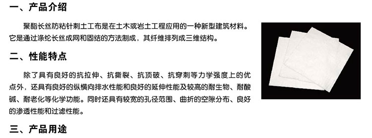 長絲土工布為聚酯長絲針刺無紡土工布,不含化學添加劑,也不經(jīng)熱處理,是環(huán)保型的建筑材料。