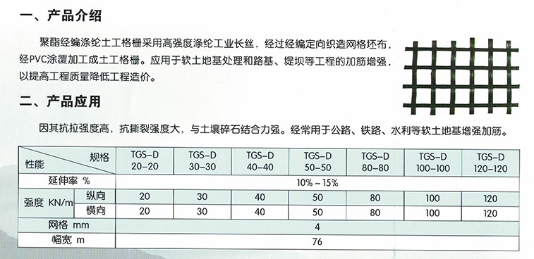 聚酯經編滌綸土工格柵采用高強度滌綸工業長絲,經過經編定向織造網格坯布,經PVC涂覆加工成土工格柵。應用于軟土地基處理和路基、堤壩等工程的加筋增強,以提高工程質量降低工程造價。